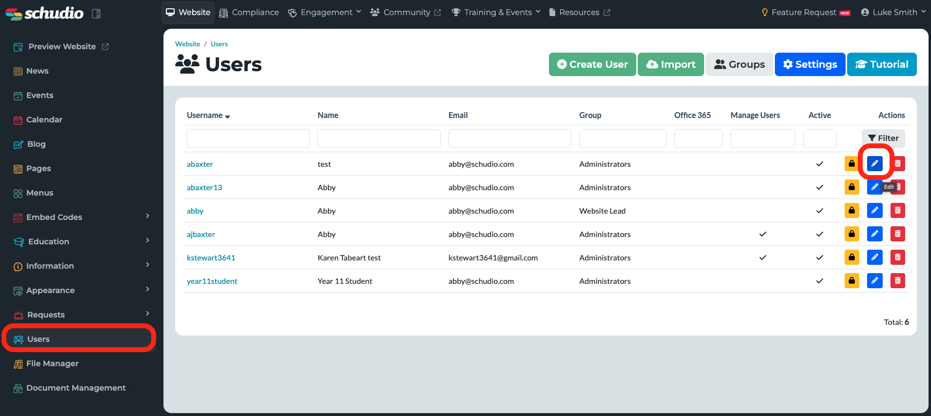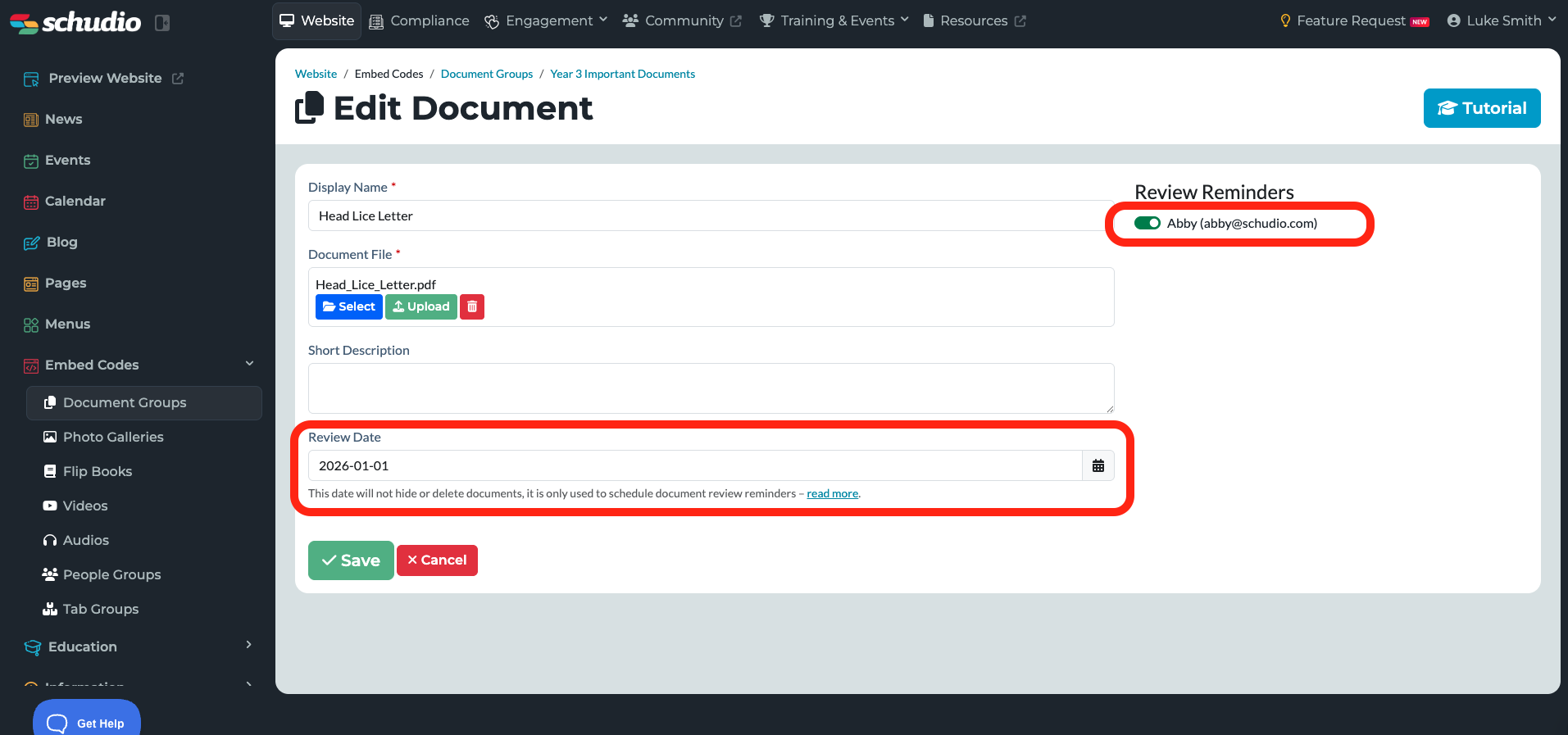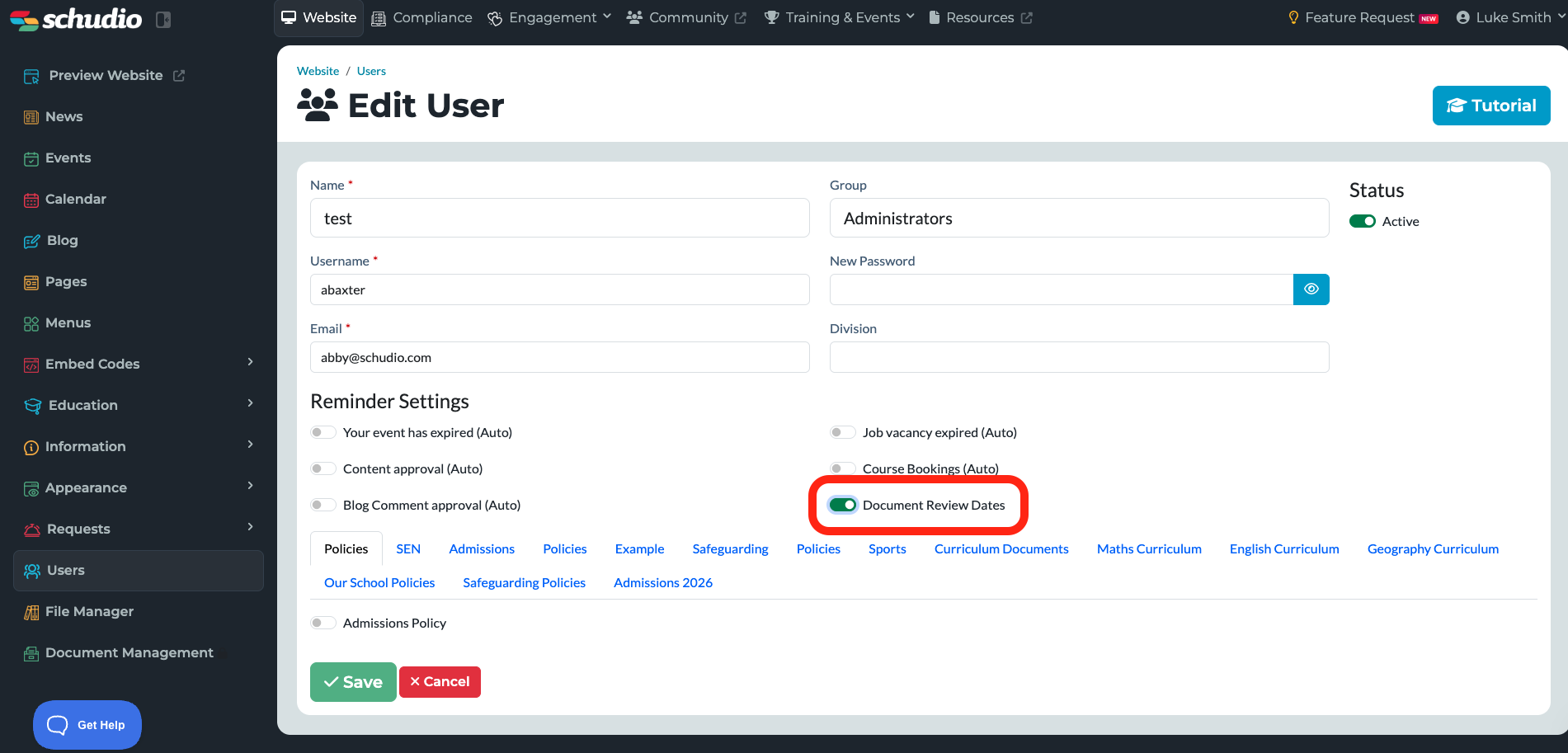 - In the edit user screen, find Reminder settings and toggle ON — Document Review Dates.