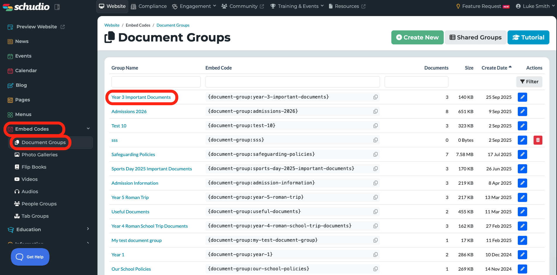 To effectively use the document module, a Group should be setup first. You can do this by going to Embed Codes >> Document Groups.