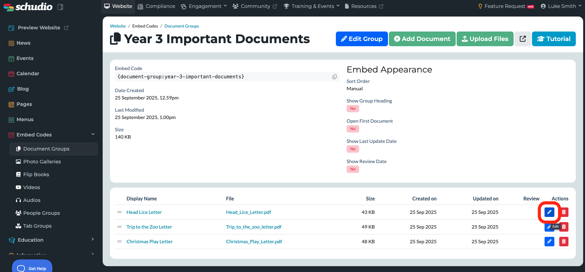 After clicking the blue pencil, the document form will appear, click select or upload in the Document field to choose a new document, and after saving it will be replaced in the group and wherever the group is embedded on the site.