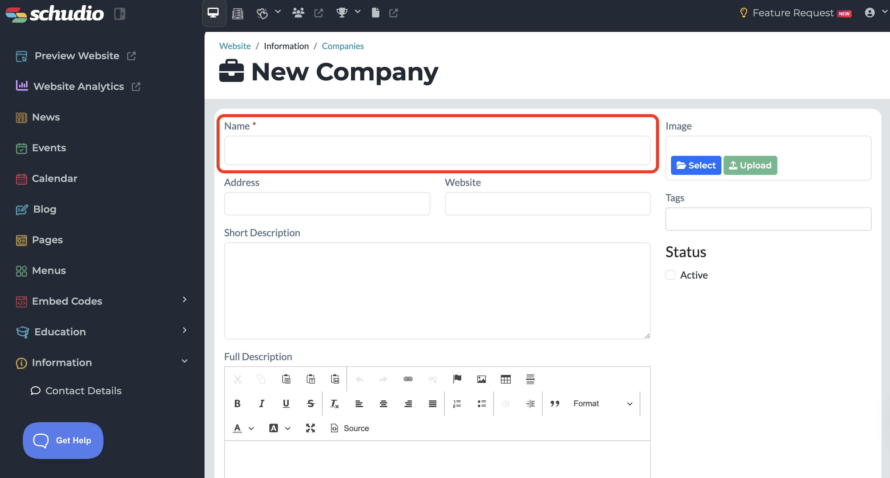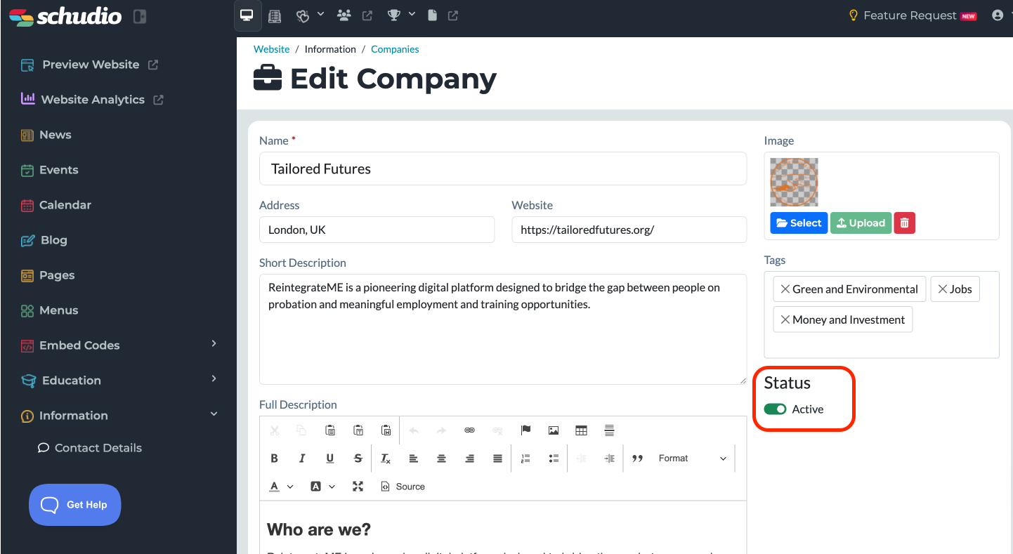 If the status is not set to active before saving, the new company will not show on your website.