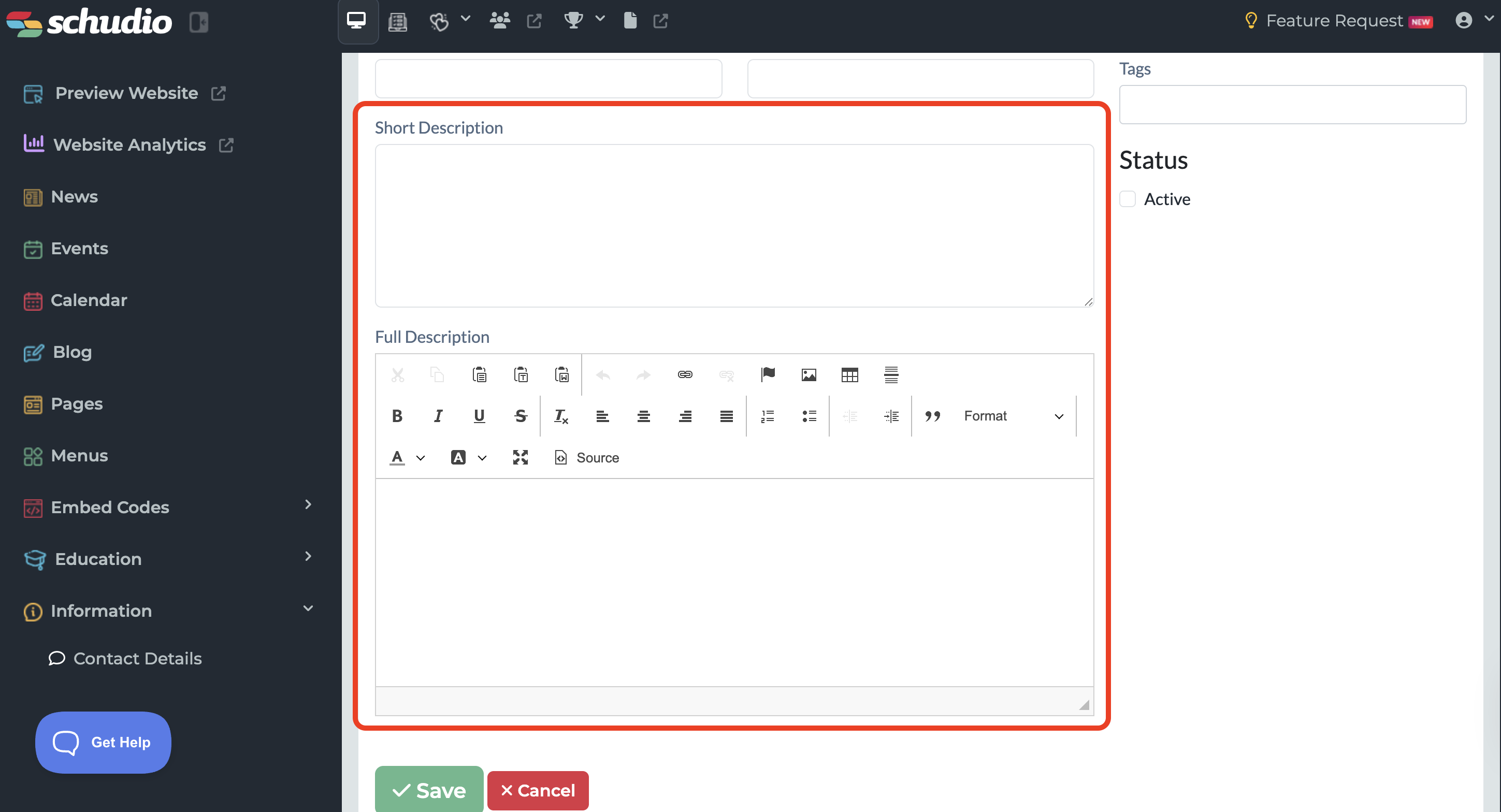 - Status – Once you've filled out all of the necessary fields, ensure Status is set to Active and select the save button at the bottom of the page.