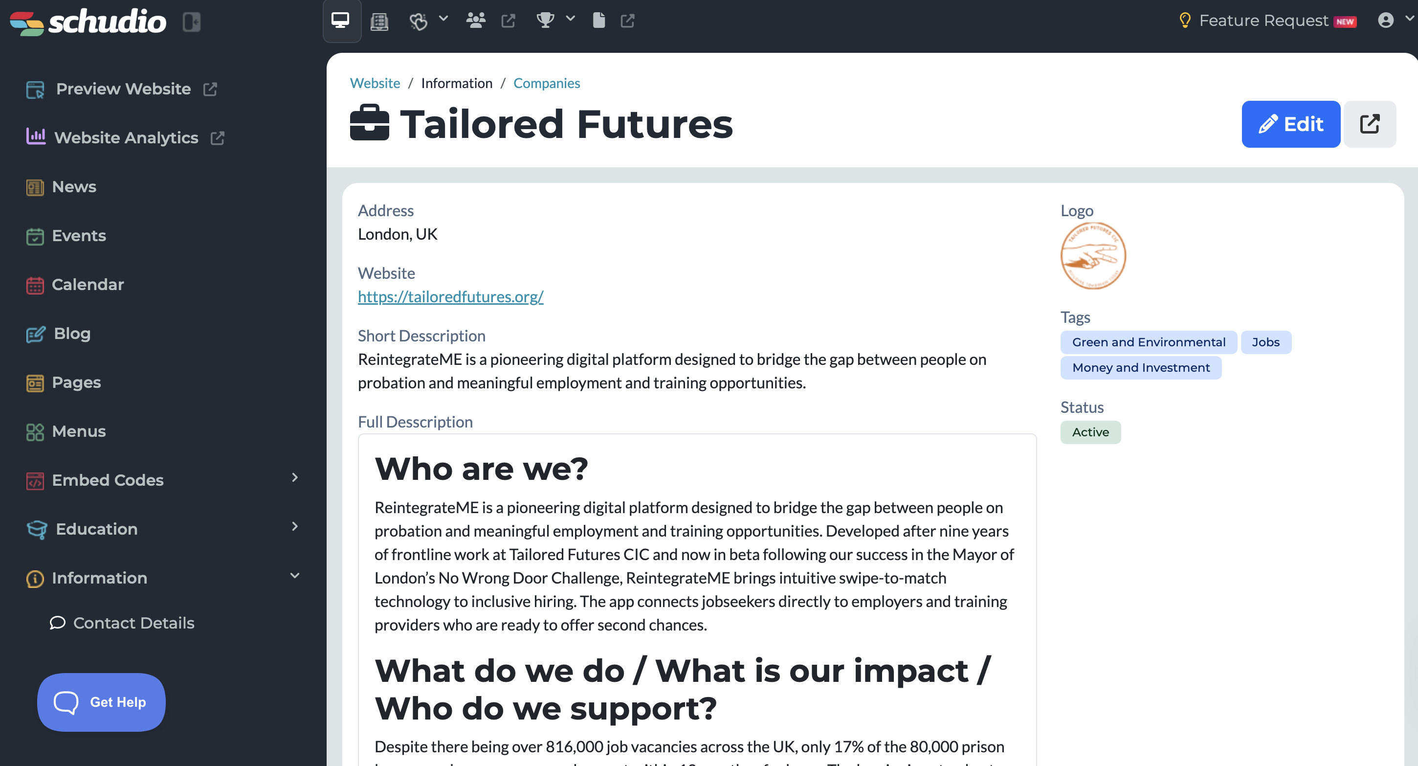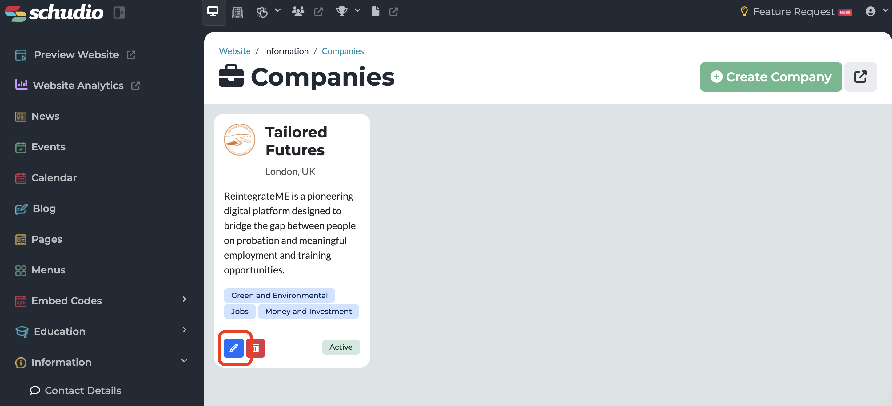 - To make edits to the general content, select the blue pencil, and you will then be taken to the Edit Company page: