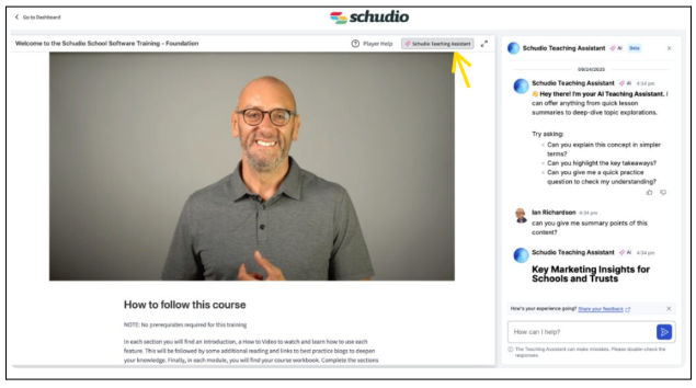 The Schudio Teaching Assistant is your built-in support tool while you’re completing courses in SchudioTV.