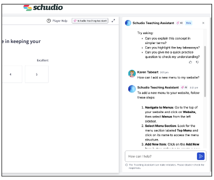 The Teaching Assistant is designed to help with questions about the training content. If you need help with your specific school’s CMS setup or run into a technical issue, please contact Schudio Support.