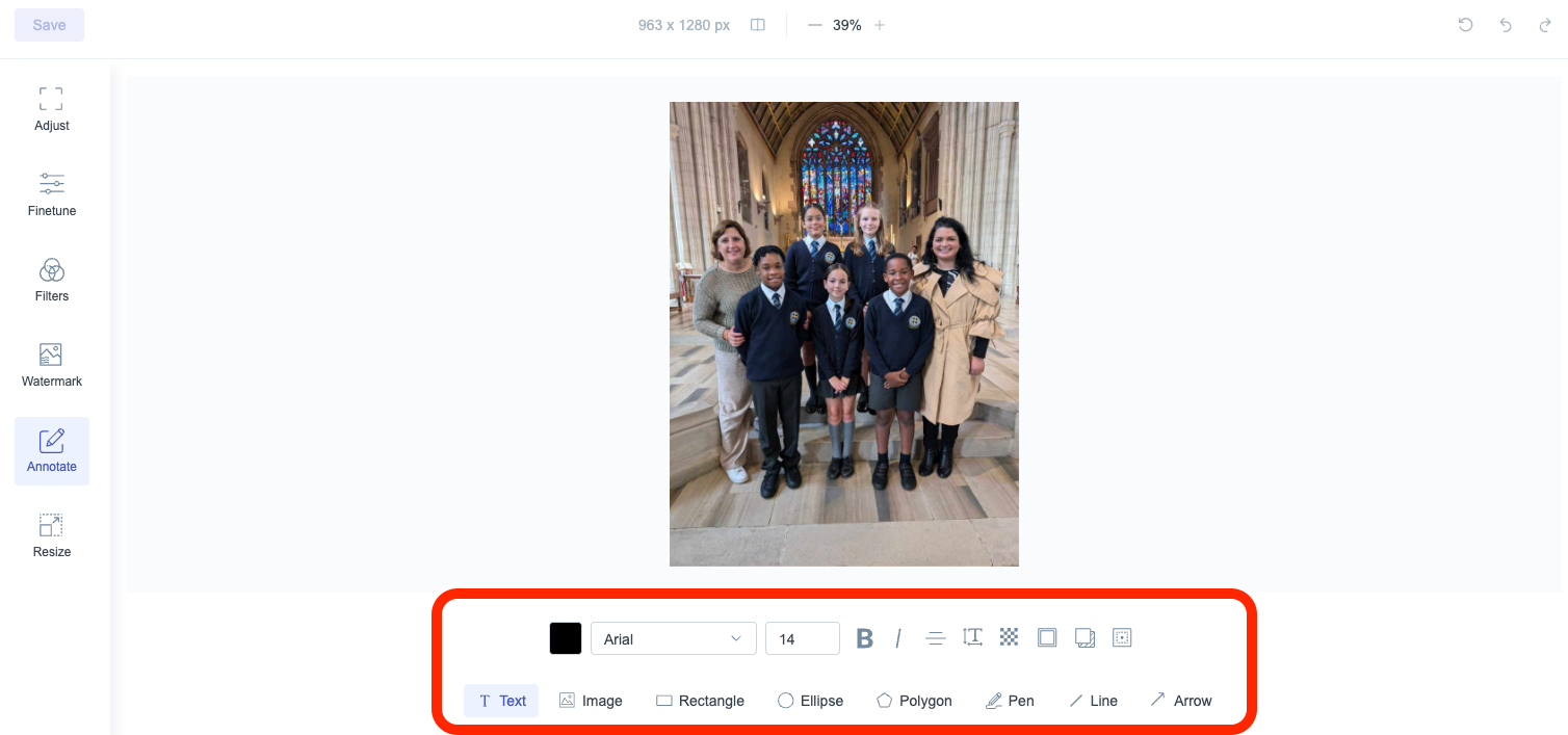 Adding text to your images can be great for communication important or exciting information. Click the "annotate" button on the left hand side and double click on the text to add your text.